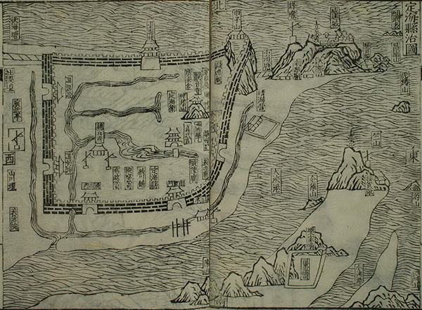 另一套值得一提的方志地图是《嘉靖宁波府志》地图。《嘉靖宁波府志》修成于明嘉靖三十九年(1559年),为本郡鄞县人南京兵部尚书张时彻编纂。随着嘉靖大倭患的爆发,明朝政府先后在宁波设立海道副使、浙直总兵等官职,本书《郡治图》和《定(镇)海县境图》内的公署正反应了这段抗倭史。