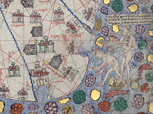 第一张收录的外文地图是1375 年《加泰罗尼亚地图》,它因出版地而得名,被誉为“中世纪最好、最丰富完备的一幅世界地图”。14世纪,统治加泰罗尼亚的是阿拉贡王国。阿拉贡以航海与贸易为特点,所以十分重视航海图。亚伯拉罕·克莱斯克绘制了这幅中世纪欧洲航海图,文字为拉丁文,该图是当时了解东方的必备地图。在中国沿海有一个在Cansay(行在音译,即南宋故都杭州)附近的港口城市,叫Mingio,这便是指宁波故名“明州”的音译。