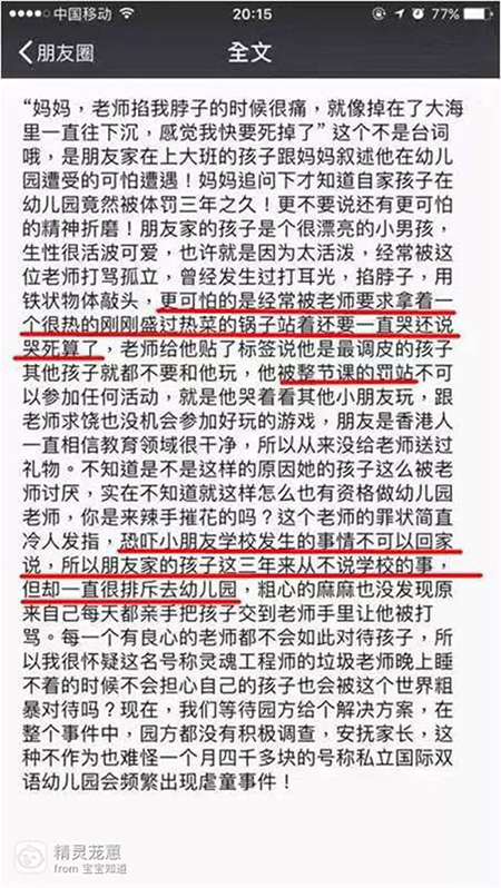 文章称,当孩子升上大班后,班中有胆子大的同学开始拒绝上学,并告诉家长因为老师打人,有家长看不下去,才告诉这名妈妈。