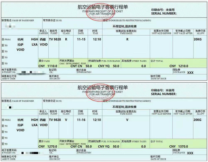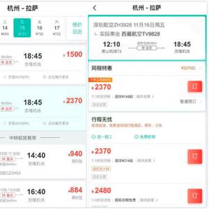 11月初,网友小叶(化名)在同程旅游网站上预订了11月15日和16日从杭州飞拉萨的西藏航空TV9828两张机票。同程旅游网站显示的票价为“7.1折经济舱”2370元(不含税),当天在同程网站购票下单还分别有立减905元、945元的优惠活动。最终,小叶分别以1425元、1465元(两张机票价格均不含税),共计2890元的价格买下了杭州至拉萨的两张机票。