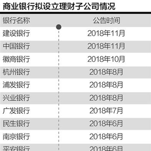 11月15日,中国银行发布公告称,拟以自有资金出资不超过人民币100亿元,发起设立全资理财子公司中国银行理财有限责任公司,注册地拟为北京。一天之后,建设银行也发布公告,拟出资不超150亿元人民币投资设立全资子公司建信理财有限责任公司,注册地拟为深圳。