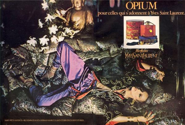 尽管圣罗兰方面声称“鸦片”命名是一种浪漫主义象征,但八十年代中期,品牌还是仗势欺人将中国和毒瘾透过影像呈现了出来。在加拿大超模琳达·伊凡吉莉丝塔主演的该款香水广告中,白人女主角因为“鸦片”用尽而表现得像毒瘾发作一般焦躁不安,她在中式锣鼓的背景音乐中来到带有粤地风情的码头麻将咖啡馆,寻找贩售“鸦片”者,最后从一个东方商人那里买下“鸦片”香水。整个过程模拟毒品买卖,而广告中的中国仍然有如民国初年,贫穷肮脏,人民好赌嗜毒。这则广告也遭到了美国华人的反对和抵制,此后圣罗兰“鸦片”系列广告仍然使用“瘾”作为广告表现的主要手法,但几乎不再出现明确指向中国的影像。在1900年大卫·林奇执导的“鸦片”广告中,后半程中女演员仍然表现成瘾症状,只有开头的折扇和吊眼梢令人联想到东方。