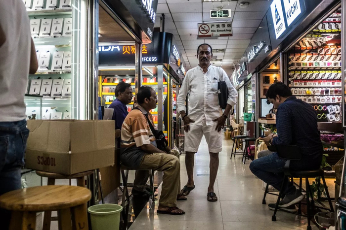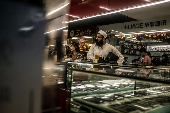 大厦内部,有年代感的电梯狭窄、逼仄,许多人习惯穿过墙壁污黑、栏杆锈迹斑斑的阴暗楼道。市场灯火通明,与楼道对比,甚至可以说过分明亮。每一层的景观都差不多,档口密密匝匝,如同迷宫,即使在楼里工作了十年,依然可能迷路。楼道并不宽敞,你很难避免与来自印度、中东或者非洲的商人肢体碰撞,香水味、食物的香料味混杂着手机壳的橡胶味,扑面而来,又倏忽而逝。
