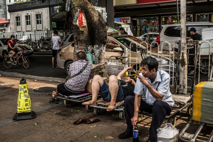没有生意的时候,郝红梅和同乡们躲在树荫里,靠在小推车上,打扑克、聊家长里短,或者看着来往的行人发呆。对于女搬运工,偶尔有人会投来略带惊诧与同情的目光,但随即收回。这是来自另一个世界的片刻理解与温存。
