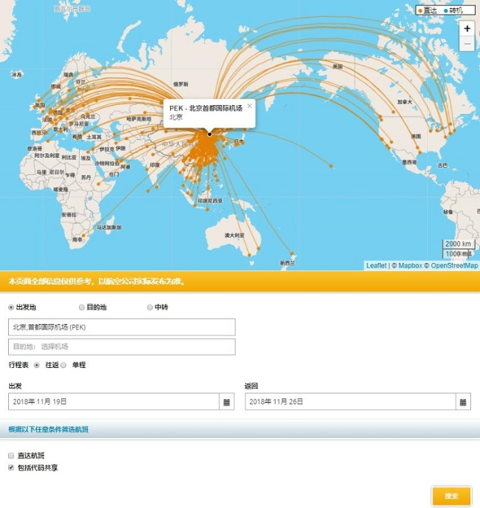 千龙网北京11月26日讯,来自首都机场集团的最新消息提到:首都机场官网正式推出航线图产品,该产品以可视化图像向旅客展示首都机场丰厚的航线网络,比文字信息更加直观、更加形象。同时,还可以让旅客通过点击航线、输入地点、选择日期等多个维度搜索或筛选航班,更加细致地了解航班信息,获取更有力的出行参考。