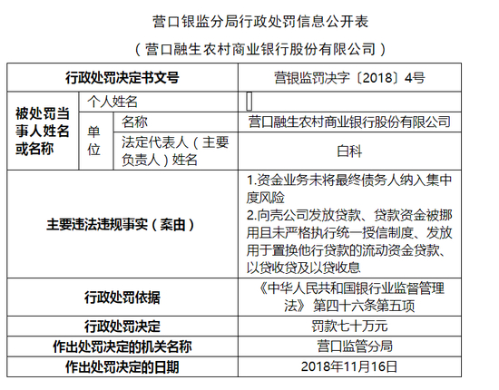 营口银监分局决定对营口融生农村商业银行股份有限公司处以罚款70万元,相关责任人白科、刘世友分别被予以警告被罚款5万元;相关责任人周志龙、付洪贺被予以警告。