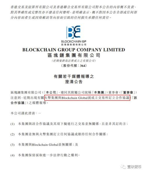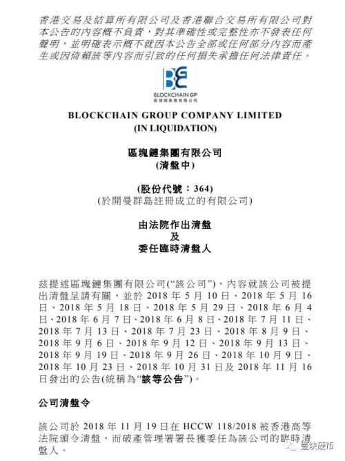 11月19日,区块链集团(00364.HK)发布公告,该公司于2018年11月19日在HCCW118/2018被香港高等法院颁令清盘,而破产管理署署长获委任为该公司的临时清盘人。同时该公司股份自2018年11月19日下午1时正起于香港联合交易所有限公司暂停买卖。