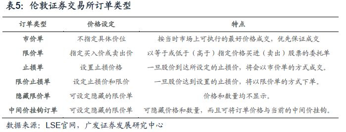 伦敦证券交易所提供多种订单类型,包括常规的市价单、限价单,也包括止损单、限价止损单、隐藏限价单和中间价挂钩订单等。