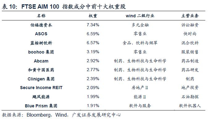 截止2018年10月31日,指数成分中前十大权重股分别为:伯福德资本、ASOS、蓝桉树饮料、boohoo集团、Abcam、和黄中国医药、Clinigen集团、Secure Income REIT、飓风能源、Blue Prism集团。