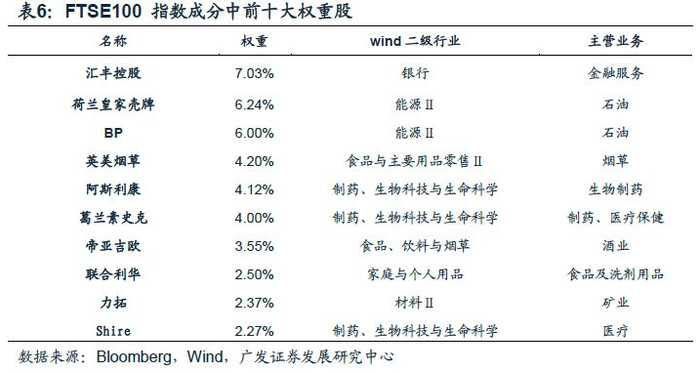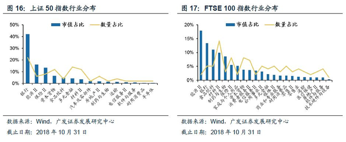 上证50指数以金融板块为主导,金融板块市值占比达到60%。FTSE 100指数行业分布相对更加均衡,消费板块市值占比26%、金融占比21%。