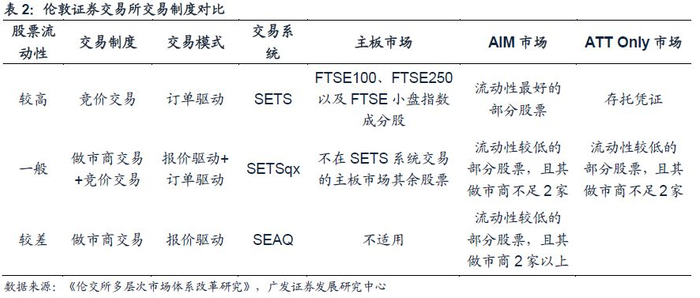 按照股票流动性采取了不同的交易制度和交易系统。对于流动性较高的股票,通过SETS交易系统进行竞价交易;对于流动性一般的股票,通过SETSqx 系统,采用做市商报价驱动与集合竞价相结合的混合市场机制;对于流动性较差的股票,通过 SEAQ 系统进行做市商交易。