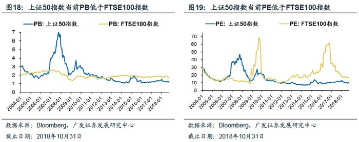 上证50指数的整体估值低于FTSE 100指数。2015年以来,上证50指数的市净率在1至1.5倍之间波动,FTSE100指数市净率在1.5至2倍之间波动,未见大幅波动。而FTSE100指数市盈率波动较大,15-17年呈上升趋势,最高达到64倍,之后不断回落。在18年处于10倍左右水平,与上证50指数相近。