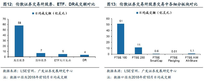 就狭义的伦敦证券交易所而言,2018年前10月股票等权益类产品日均成交额为74亿美元,细分品种中,股票日均成交额65亿美元(其中英国股票、国际股票日均分别为58亿美元、7亿美元),占伦敦证券交易所比重为88%;ETF及衍生品日均成交额5亿美元,占比7%;DR存托凭证日均成交额4亿美元,占比5%。对股票成交额进一步细分,主板日均成交额63亿美元,占比达到98%;而创业板(即AIM市场)日均成交额1.1亿美元,占比仅为2%。主板中交易又主要集中在FTSE 100指数为代表的大盘股中。