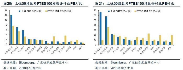分行业看,上证50指数多元金融、保险、能源、资本货物、运输行业估值低于FTSE100指数,而在食品饮料、制药与生物、耐用消费品、电信服务的估值高于FTSE100 指数。我们采用中位数法对比同一行业的估值水平。上证50指数在多元金融、保险、资本货物、能源、运输行业的PB与PE均低于FTSE100指数,而在食品饮料、制药与生物、耐用消费品、电信服务等行业的PB与PE均高于FTSE 100指数。从PE角度看,上证50指数的材料、软件与服务、房地产、银行估值更低,但从PB角度看,上述行业的估值要高于FTES 100指数。