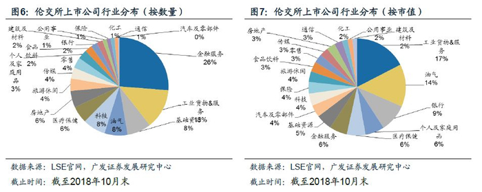 伦敦证券交易所工业、金融、资源等行业占比较高。根据伦交所官网,截至2018年10月末,伦敦证券交易所共有上市公司2152家。从数量维度看,占比较高的行业分别为金融服务(26%)、工业货物及服务(13%)、基础资源(8%)、油气(8%)、科技(8%)。从市值维度看,占比较高的行业分别为工业货物及服务(17%)、油气(14%)、银行(9%)、个人及家庭用品(6%)、医疗保健(6%)。