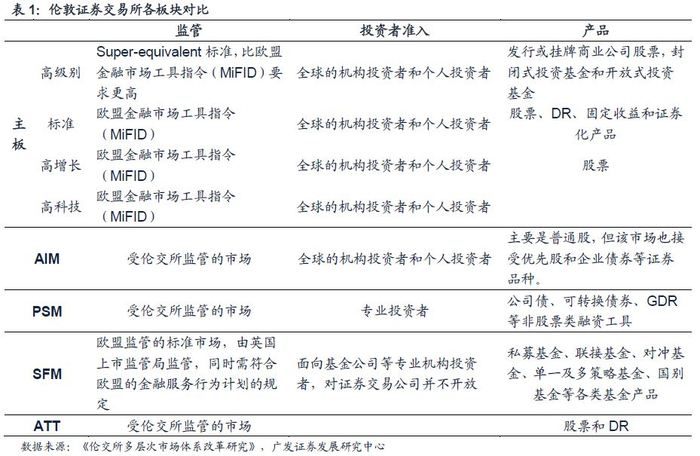 伦交所包含四大市场板块:主板市场(Main)、另类投资市场(AIM)、专业证券市场(PSM) 以及专家基金市场(SFM)。主板市场可细分为四个子市场;AIM市场是伦敦证券交易所的创业板市场,定位于满足成长型小企业的融资需求;PSM市场仅面向专业投资者,产品包括公司债、可转换债券、GDR等;SFM市场是仅向专业机构开放的基金市场。