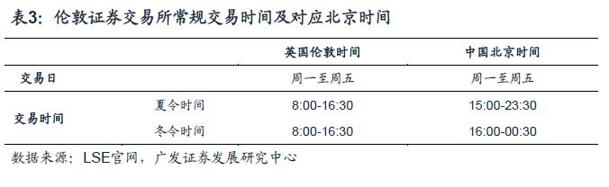 一般来说,伦敦证券交易所常规交易时间为当地时间周一至周五的8:00-16:30。由于英国实施夏令时制度,夏令时中国比英国早7个小时,因此伦敦证券交易所交易时间对应的中国北京时间为15:00-23:30。冬令时中国比英国早8个小时,对应的中国北京时间为16:00-00:30。欧洲2018年冬令时从10月28日开始至2019年03月25日。