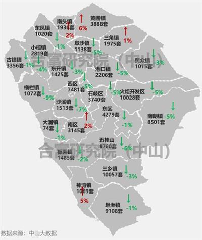 库存方面,呈现出下降趋势。根据合富研究院(中山)数据监测:2018年11月25日,中山市住宅库存84089套,环比下降3%。其中三乡镇10057套居全市镇区住宅库存榜首,火炬开发区10028套排名第二,坦洲镇9108套排名第三。