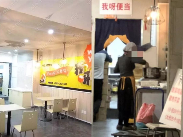 此外,第三方平台存在大量商家照片与实际不符的情况。“我呀便当(中关村店)”在“饿了么”上提供的商家信息照片里后厨与大堂区分明确,但在“我呀便当”实体店面中,墙壁上并无商户的大型标牌,只有通往后厨的门墙上贴着一块白板,印有“我呀便当”的字样。堂食区只摆放了两张小桌子,店内就餐人员也为数寥寥,工作人员在墙前安置了一张长桌,架起锅碗直接在厅内炒菜。