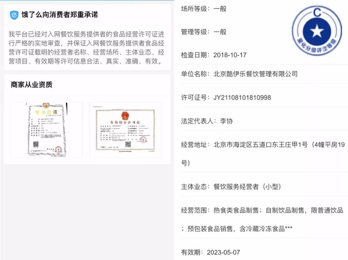 但在“饿了么”app上,多数商户页面仅能查询到营业执照与食品生产经营许可证。上文提及的“椒娘冒菜”在“饿了么”“美团外卖”两家平台皆有注册。“美团外卖”显示其量化分级评定等级为C,而同样的信息在“饿了么”平台上并无公示。