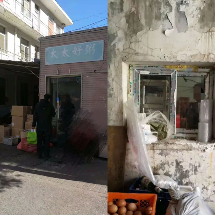 苏州街75号院是一片住宅区。由大门向里走几步,可见一间灰粉平房,墙壁上挂着一块褪色蓝招牌,写着“太太好粥”,大门两侧堆着五六只纸箱,一篮韭菜搁在门外板凳上。室内没有开灯,一张堆满外卖的长桌将内部分割开,朝外的空间狭小昏暗,拥挤着众多外卖配送员。