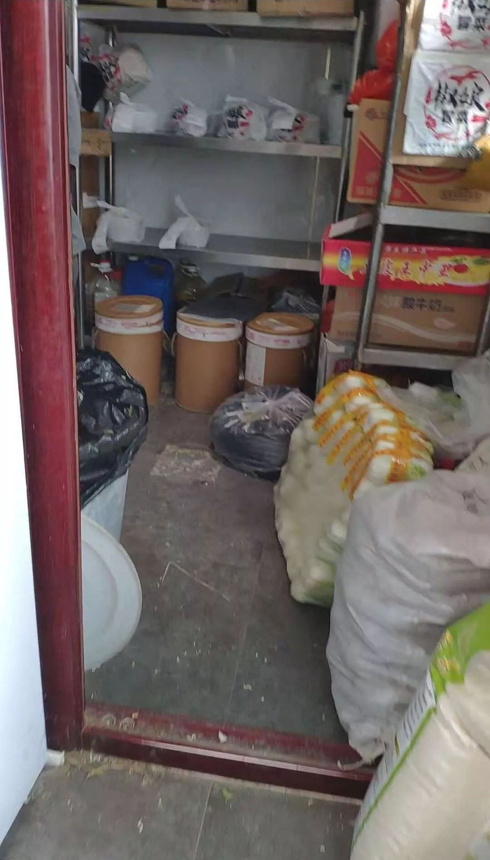 在寻找一家名叫“椒娘冒菜”的外卖店时,此间记者跟随一名外卖配送员进入了路边一处拆迁中的平房,即海淀区五道口东王庄甲1号。平房内部三面闭合,中央空地堆满大量蛇皮袋,上面印有“大米”“瓜子”等字样,空地东面是一家韩式烤肉店。北屋正厅里四处堆放着杂物,地面脏污,墙壁剥蚀严重,屋子向内有一条东西延伸的走道,通往三间厨房,而尽头的厨房物架上摆有杂物箱,箱体贴着“椒娘冒菜”的标志。
