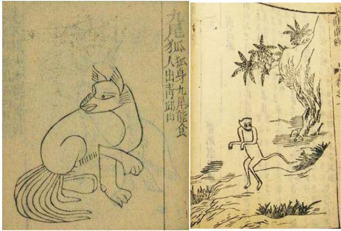 左图为清代吴任臣所绘九尾狐,右图为明代蒋应镐、武临父所绘狌狌(xīng xīng)