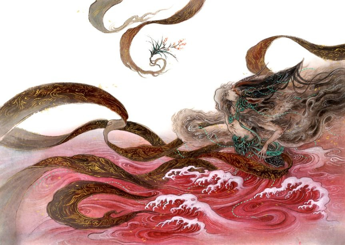 【解读】按《山海经》的描述,陵鱼应该跟西方童话中的美人鱼差不多。它们生活在海中,有着人的面容和人的双手,与美人鱼不同的是,陵鱼还长有人脚。