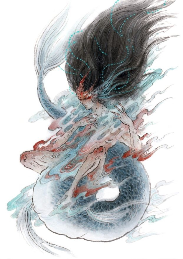 与陵鱼相对应的还有鲛人,其眼泪能化成珍珠,见于晋代干宝所著的《搜神记》,“南海之外,有鲛人,水居,如鱼,不废织绩。其眼泣,则能出珠。”