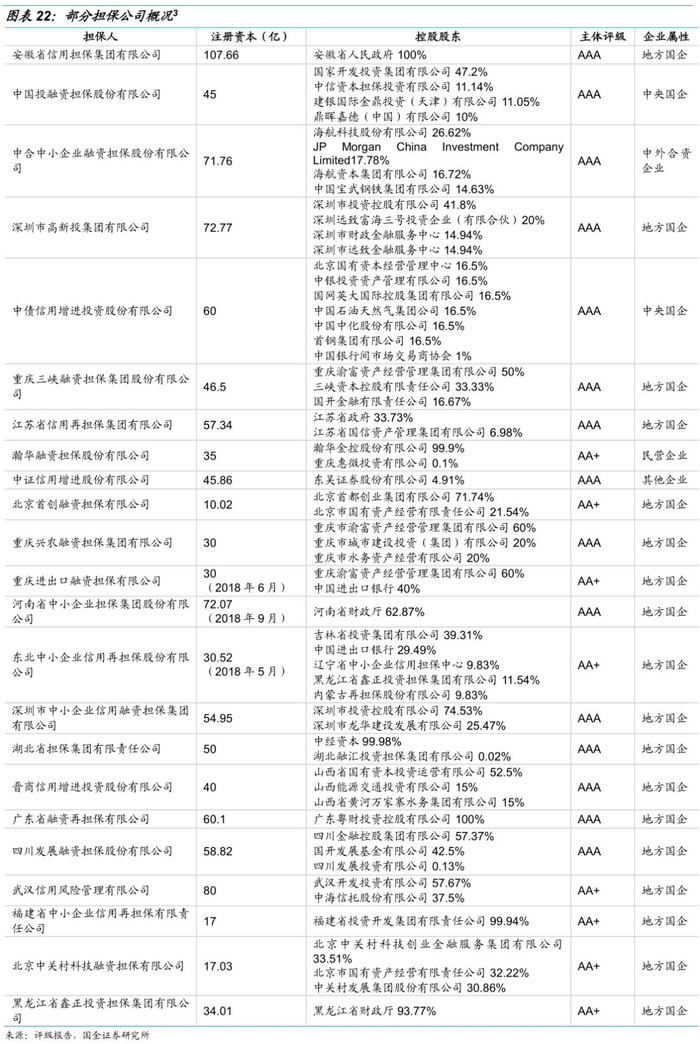 本文主要是从债券增信的角度来评价担保公司,因此我们只筛选了仍有存续担保信用债、且披露信息较为完善的23家担保公司进行具体分析,为债券提供担保服务的担保公司中,以地方国有企业的担保公司为主,另有三家中央国有企业(中投保、中债增)、一家民营企业(瀚华担保)、一家中外合资企业(中合担保)和一家其他企业(中证增)。已获得AAA评级的担保公司共15家,AA+评级的担保公司8家。