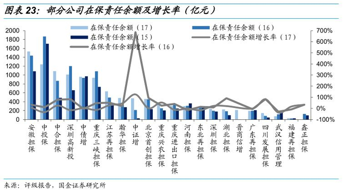2017年年末在保责任余额超过1000亿元的有深圳高新投、中合担保、中投保及安徽担保,从在保责任余额增长率来看,河南担保、广东再担保与武汉信用管理连续两年在保责任余额增长率为负,而中证增的增长率超过100%。[4]