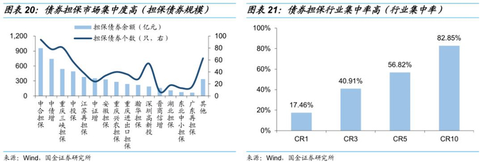 担保公司担保债券概况:第三方连带责任担保是债券发行人使用的主要担保方式,其中采用专业担保公司担保的债券占比33%。专业担保公司对债券评级有明显的提振作用,外部市场对其增信实力认可度较高。从债券种类的分布来看,担保公司担保债券的种类主要为企业债,从债券剩余期限分布来看,剩余期限主要为3-5年及5年以上的债券,城投债更多依靠担保公司担保发行,产业债担保主要集中在周期性行业。债券担保行业市场集中度较高,前五家担保公司占据了市场过半的份额。