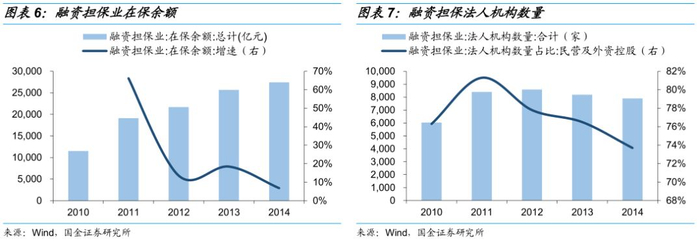 《暂行办法》对融资担保公司注册资本的要求仅为500万,准入门槛较低, 2011年涌入大量民营担保公司,当年,全国融资担保业在保余额增速达到66.22%,同时民营及外资控股法人机构数量激增,占比高达81%,导致过度的市场化竞争,部分地区担保公司不经营担保业务,甚至从事非法吸收存款、非法集资、非法理财等违法违规活动,担保公司风险事件的相继爆发,我国在2011年和2014年分别对融资性和非融资性担保公司进行清理整顿,民营及外资控股机构数量与占比明显下降。