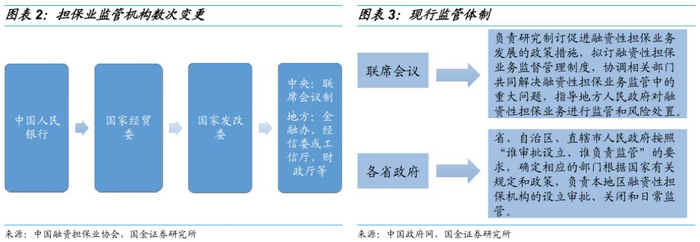担保行业发展概况:担保方式分为融资担保与非融资担保,融资担保是指为被担保人借款、发行债券等债务融资提供担保的行为,担保行业的监管主体经历了数次变更,直至2009年联席会议制度建立,监管主体才尘埃落定,而非融资担保的监管则尚待明确。2009年《融资性担保公司管理暂行办法》发布之后,由于准入门槛偏低,11年涌入大量民营担保公司,担保行业过度化竞争,部分担保公司从事非法活动,担保公司风险事件相继爆发。2017年,《融资担保公司监督管理条例》正式发布,担保行业的监管步入正轨。