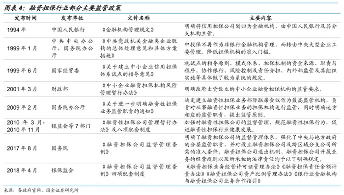 2009年2月国务院办公厅发布《关于进一步明确融资性担保业务监管职责的通知》,决定建立融资性担保业务部际联席会议对融资担保业务进行监督管理;随后银监会、发改委等七部门发布《融资性担保公司管理暂行办法》(以下简称《暂行办法》)对融资性担保公司的注册资本、业务范围、经营规则、风险控制及监督管理等做出了具体规定,融资担保行业进入规范整顿阶段,担保机构的监管职责开始明确,担保行业步入规范运作、持续整顿的阶段;《暂行办法》配套的八项制度进一步对中小企业担保资金管理、重大风险事件报告、高管任职资格、内部控制、公司治理及信息披露等进行细化。