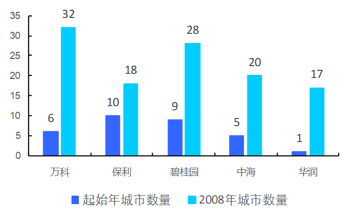 房企的地理扩张分成了横向城市扩张和纵向深耕区域两种形式。以城市数量和项目数量来看,从有数据可寻的五大房企看,万科、中海和华润在2000/2001年~2008年城市数量较猛,分别扩张了5倍、4倍和17倍。