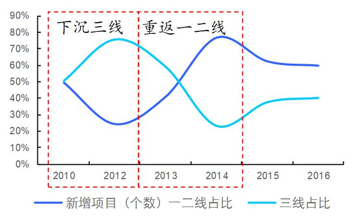 集团开始展开股权合作的模式拿地,更加注重二三线城市项目数量的均衡。2014年,一二线城市新增项目数占比76.5%。