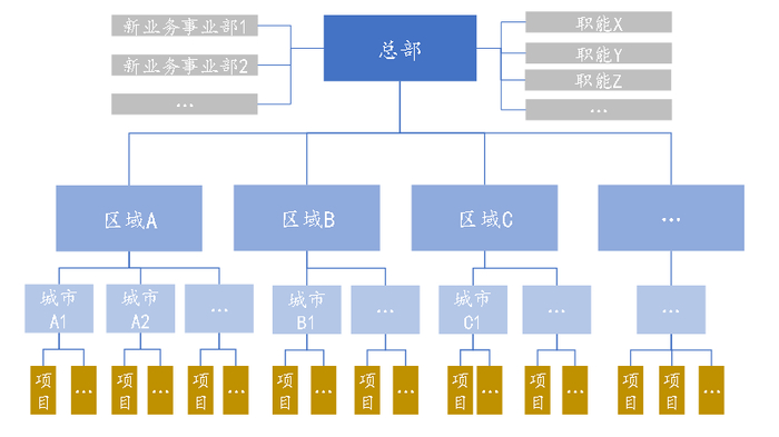 地域和业务上的扩张,必然伴随着管理架构的演变。三级架构在过去“总部-城市”的基础上增加一个区域总部,总部下放一定管理权力,扩大管理半径,以解决城市公司和项目公司增长过快带来的沟通效率受影响的问题。