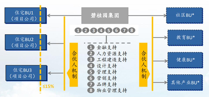 碧桂园将每个项目、每个配套产业视作单独业务单元(BU)进行运营,总部平台为每个业务单元提供八大支持,并进行现金流和收支管理。