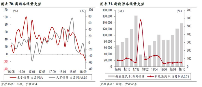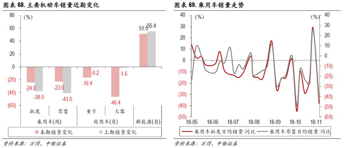 乘用车:11月第2周,乘用车批发同比下跌24%,乘用车零售下跌23%。商用车:10月重卡、大客销量同比降16.4%、46.4%。新能源车:10月销售同比增51.6%,仍高速增长。