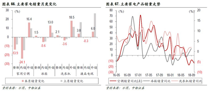 家用空调:10月,销量同比下降13。9%,内销下降24.1%,外销增加16.4%。冰箱:9月,销量同比增1.5%,内销降5.6%,外销涨13%;洗衣机:9月,销量同比升2.1%,内销降3.6%,外销升18.5%;液晶电视:9月,销量同比增3.8%,内销降0.3%,外销同比增6%。