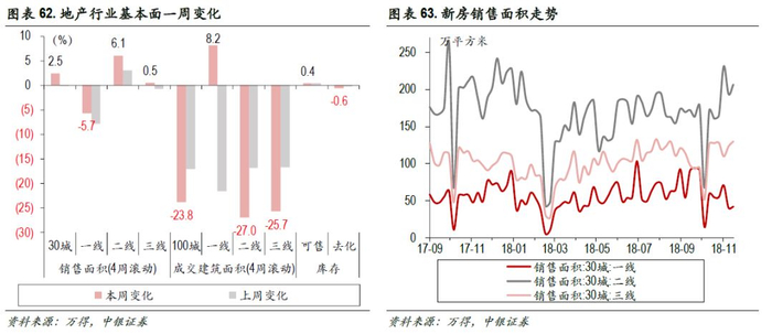 销售:11月第2周,30大中城市新房销售面积(4周滚动)环比上浮2.5%,其中,一线下跌5.7%,二线上涨6.1%,三线下跌0.5%。土地供应:本周100大中城市成交建筑面积(4周滚动)环比下降23.8%,一线上涨8.2%,二三线分别下降27.0%、25.7%。库存:11月第2周,十大城市新房可售面积增加0.4%,3个月移动平均去化周期为46.1周,环比下降0.6%。