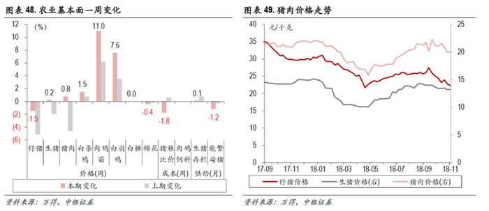 生猪养殖:本周, 22省市平均仔猪价格环比下跌1.5%,生猪价格涨0.5%,猪肉价格涨0.2%;成本方面,11月第2周,猪粮比价下降1.8%;供给方面,10月生猪存栏环比上升0.1%,能繁母猪存栏环比下降1.2%。肉鸡养殖:价格方面,本周鸡苗价格涨11%,白条鸡价格涨1.5%,白羽鸡价格上涨7.6%。其他:本周,白糖价格未更新,棉花价格跌0.4%。