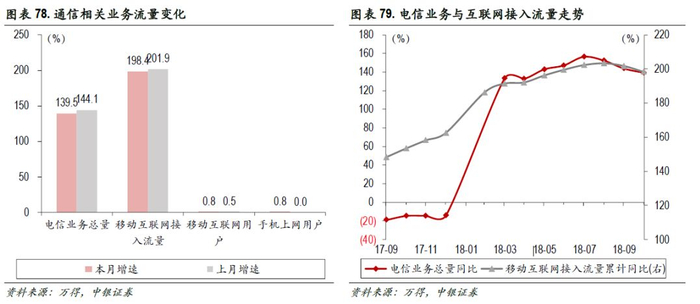 10月,电信业务总量增长139.5%;移动互联网接入流量同比增198.4%,近一年同比增速持续攀升;移动互联网用户同比上升0.8%;手机上网用户同比上升0.8%。