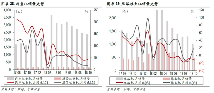 本周起重机10月销量数据更新。10月,汽车起重机销售同比增速42.8%,履带起重机同比17.8%;压路机销量环比降10.5%,前值-8.5%,推土机增17.9%,前值-15%,同比增速大幅上调。