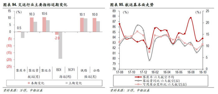 航空:10月民航客座率上涨0.5%,客运量同比增加10.3%,六大航可用座公里环比增长10.6%。海运:本周BDI指数下降2%。陆运:10月,铁路货运量同比增速10.1%,继续回升,公路货运量同比增速10%,增速持续扩大。