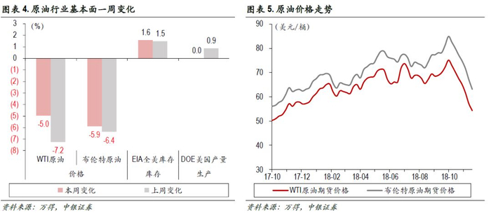 价格:本周WTI原油下跌5.0%,布伦特原油下跌5.9%。供给:全美原油库存数据并未更新,11月第3周原油产量持平前值。