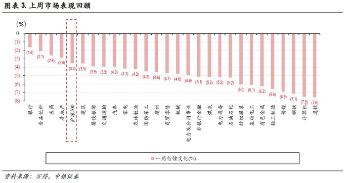 本周,行业全部下跌。跌幅较大的是通信、计算机和钢铁,跌幅较小的是银行、食品饮料和医药。