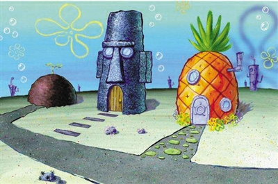 动画片中,海绵宝宝住在太平洋里的比基尼海滩(Bikini Bottom)附近的海底。这处海滩属于马绍尔群岛(Marshall Islands)中的一组岛屿,大约位于夏威夷和巴布亚新几内亚之间,是美国的前殖民地。冷战时期,美国在这里进行了23次核武器试验。
