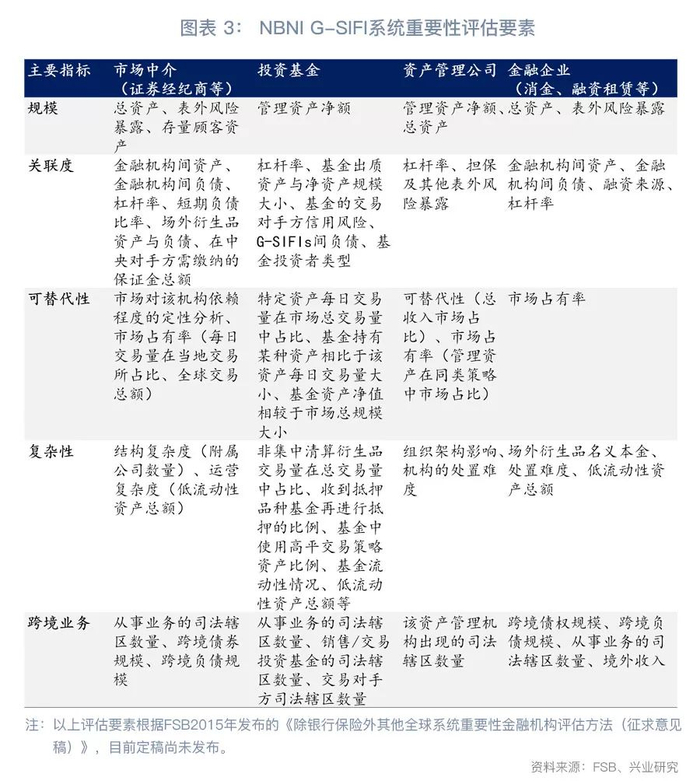 《指导意见》指出,系统重要性金融机构的评估方法将包括机构规模、关联度、复杂性、可替代性、资产变现等一级指标,与全球系统重要性金融机构的评估逻辑保持一致。其中,我们认为“资产变现”指标可能主要针对其他机构(尤其是投资基金),大致对应于国际监管“复杂性”指标下的基金流动性情况、低流动性资产总额等指标。